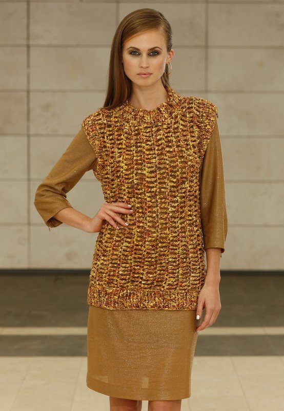 Sari Ribbon von Louisa Harding (90% Polyamid, 10% Polyester (metalisiert), LL ca 120 m/100 g): ca 300 (350-350) g Gold Fb 7; Prym-Rundstricknd Nr 8, 40 und 60 cm lang, Prym-Häkelnd Nr 8.