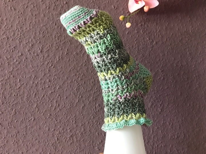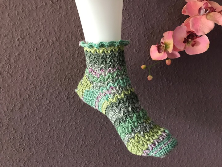 Luftige Söckchen für laue Sommerabende schnell gehäkelt. Du magst handgearbeitete Socken, dir ist die Arbeit mit einem Nadelspiel aber zu umständlich? Dann probiere es mal mit Häkeln. Du magst den Schaft doch etwas länger? Kein Problem, die Söckchen werden an der Spitze begonnen, da kannst du viel variieren.