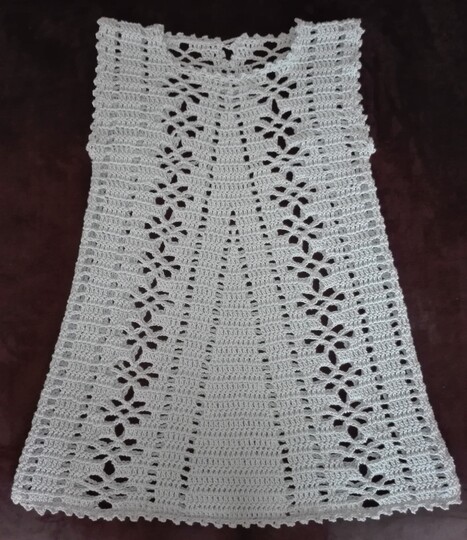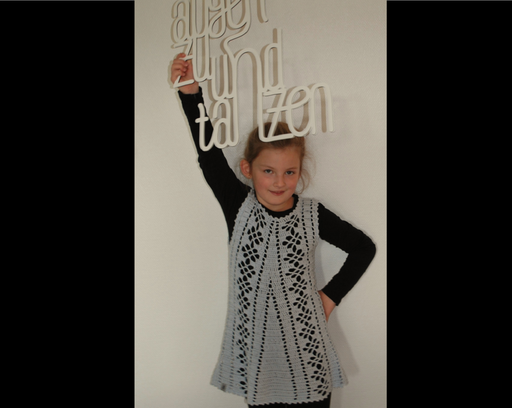 Das Grundmuster des Kleidchens besteht aus Stäbchen, wobei Vorder- und Rückenteil von 2 vertikalen, zum Hals hin spitz zulaufenden Musterstreifen, durchzogen werden. Verschlossen wird es im Nacken mit einem Holzknopf und einer Knopfschlinge.
