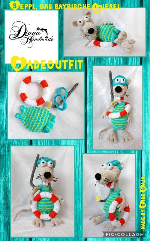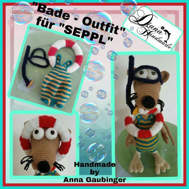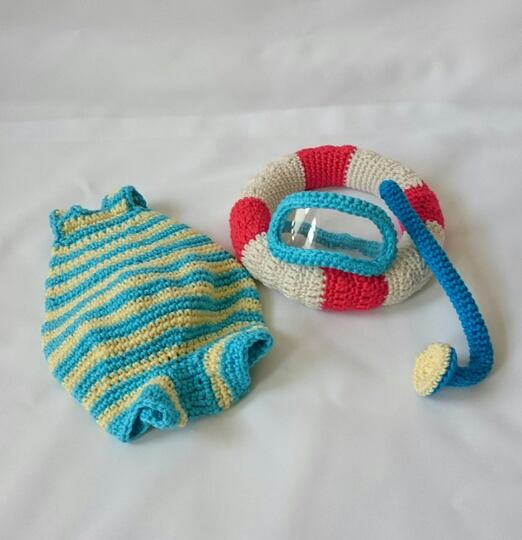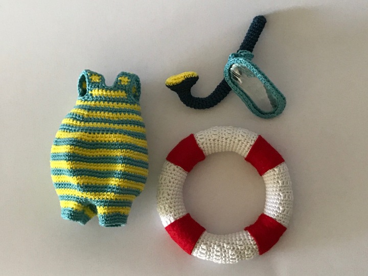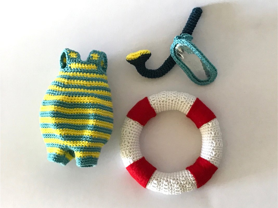 Die Anleitung beinhaltet das Bade-Outfit, die Badehose, Schwimmring, Taucherbrille und Schnorchel.
