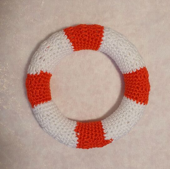 Evtl. roten Filz (wenn du die Streifen des Schwimmringes nicht häkeln möchtest), ein Stück Klettband, Leim, Pfeifenputzer,