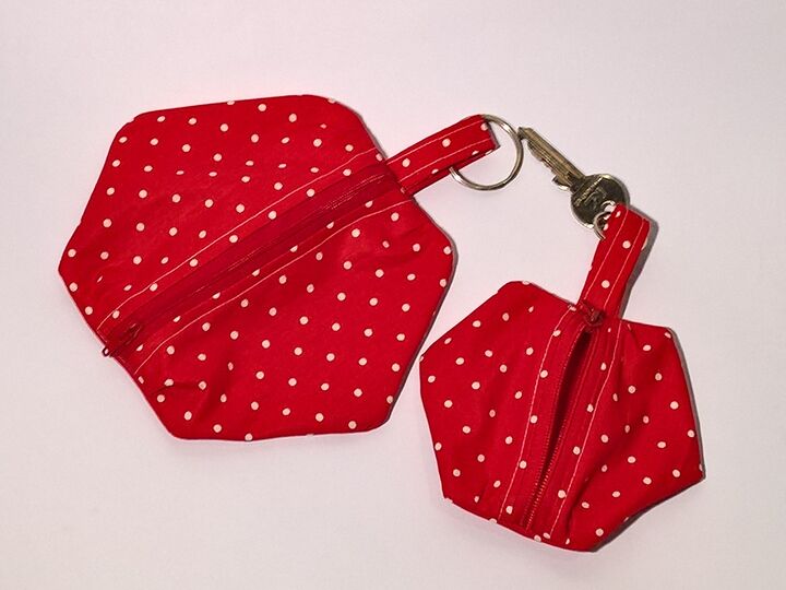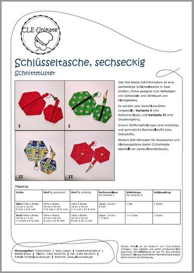 Das Ziel dieses Schnittmusters ist eine sechseckige Schlüsseltasche in 2 Größen (15 x 12 cm und 19 x 17 cm). Sie ist prima geeignet zum Befestigen von Schlüsseln und Verstauen von Kleinigkeiten.