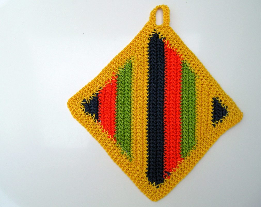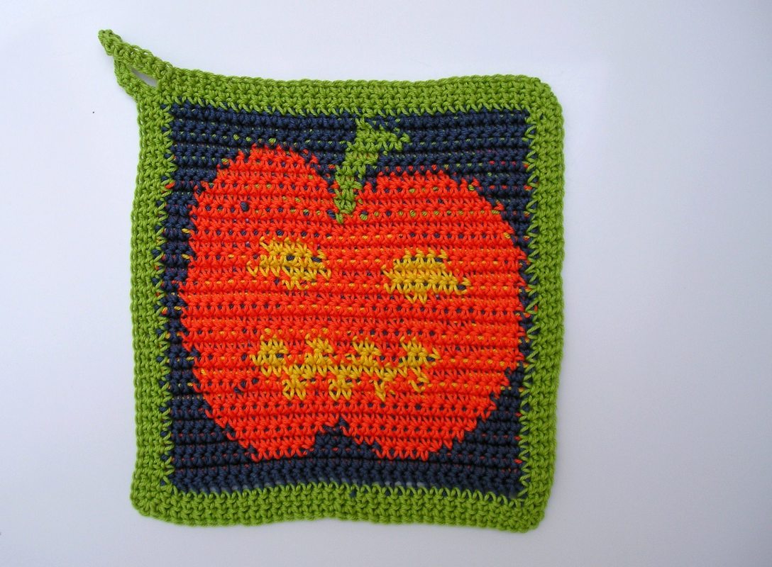 Der Motivtopflappen wird mehrfädig mit festen Maschen gehäkelt. Dabei hat man einen Arbeitsfaden und mehrere Ruhefäden. Während man mit dem Arbeitsfaden Maschen häkelt werden die Ruhefäden von den festen Maschen mit umhäkelt. Dadurch bilden die Ruhefäden auf den Rückseite keine langen Schlaufen und sind fast unsichtbar. Das ist nicht besonders schwierig und auch für Häkelanfängerinnen gut zu bewältigen. Die Anleitung enthält eine ausführliche textliche Beschreibung sowie eine Häkelschrift.