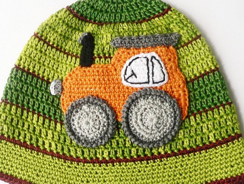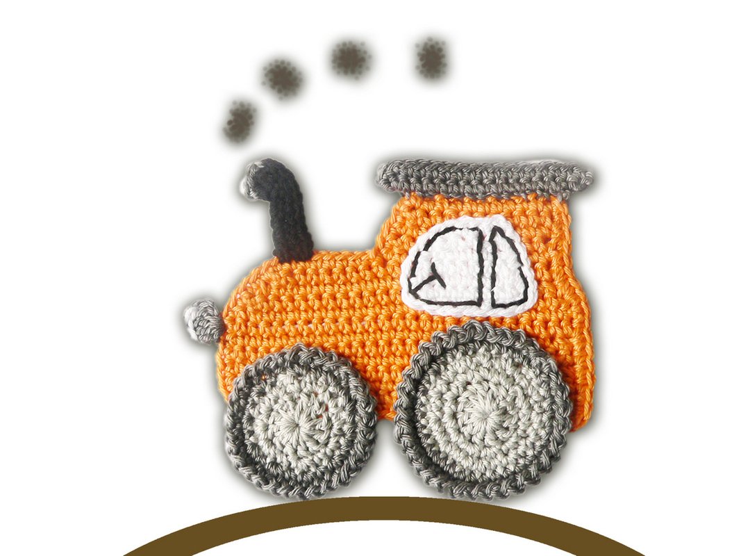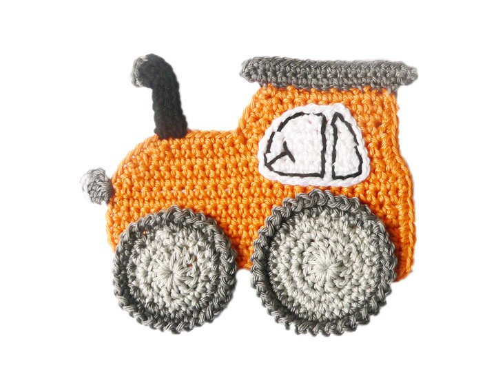 Die umfangreich bebilderte Häkelanleitung zum Häkeln von einer Applikation (einem Aufnäher) "Traktor" zum Dekorieren von Kinderkleidung.