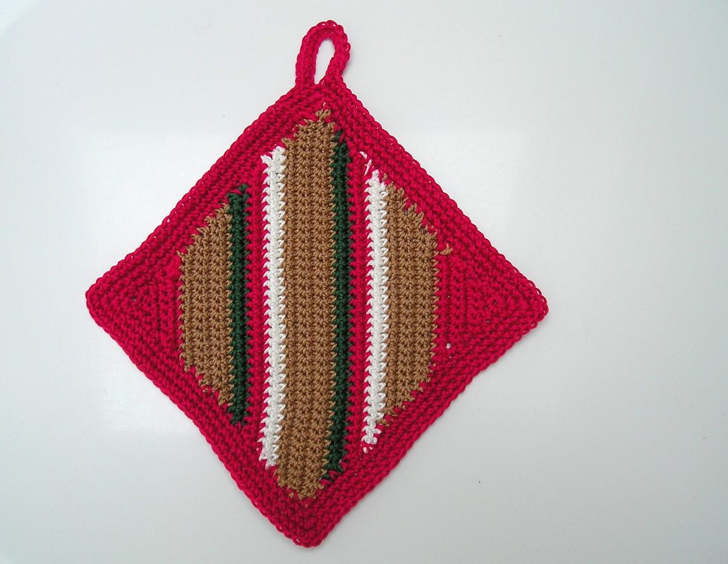 Der Motivtopflappen wird mehrfädig mit festen Maschen gehäkelt. Dabei hat man einen Arbeitsfaden und mehrere Ruhefäden. Während man mit dem Arbeitsfaden Maschen häkelt werden die Ruhefäden von den festen Maschen mit umhäkelt. Dadurch bilden die Ruhefäden auf den Rückseite keine langen Schlaufen und sind fast unsichtbar. Das ist nicht besonders schwierig und auch für Häkelanfängerinnen gut zu bewältigen. Die Anleitung enthält eine ausführliche textliche Beschreibung sowie eine Häkelschrift.