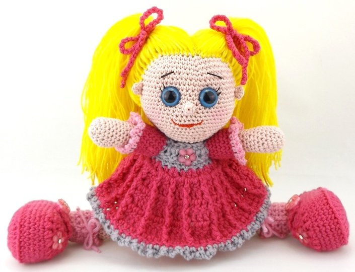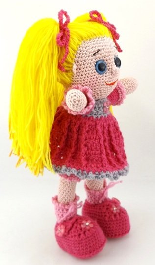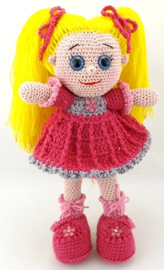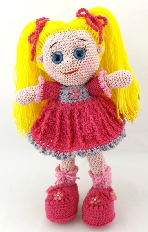 Eine genaue Schritt für Schritt - Häkelanleitung (PDF-Datei) mit vielen Bildern für die komplette Puppe inkl. Haare, Kleid, Schuhe, Socken und Unterhöschen macht das Nacharbeiten leicht. Häkelkenntnisse sollten allerdings vorhanden sein.