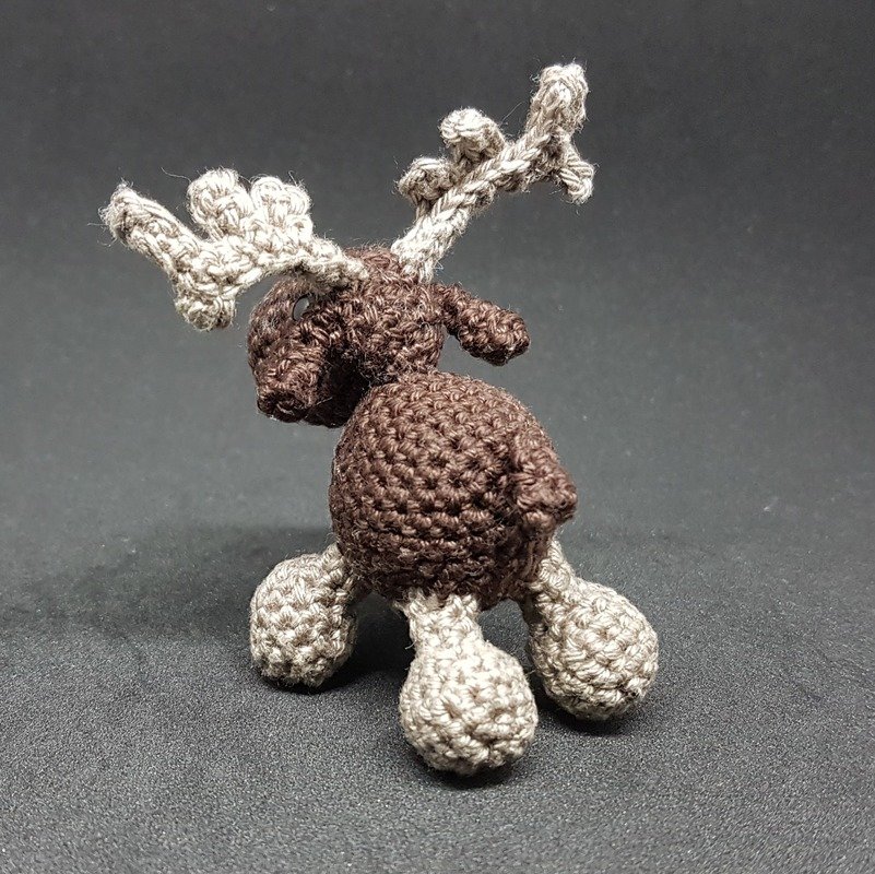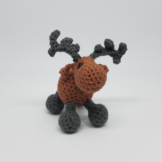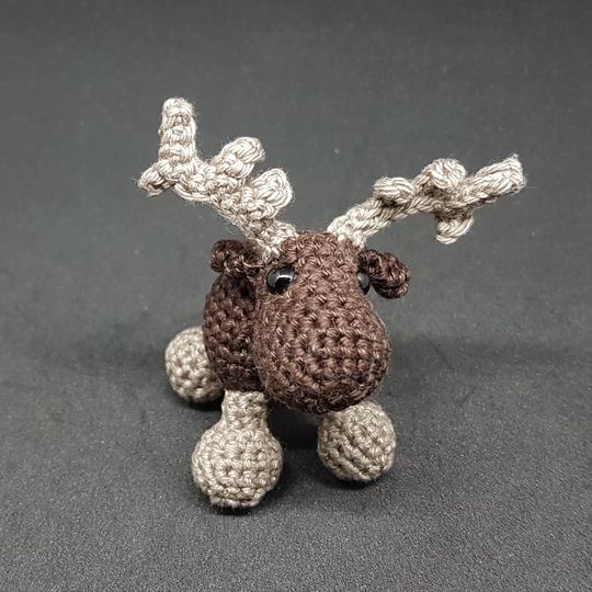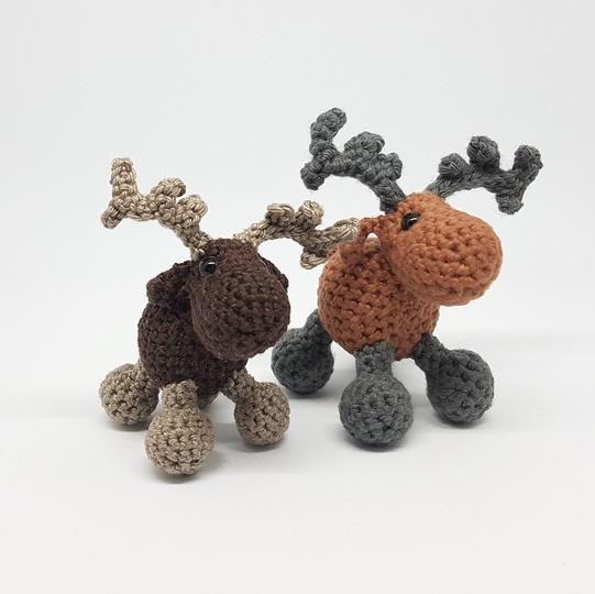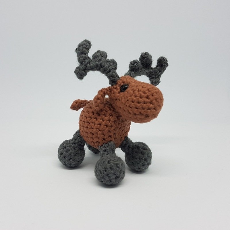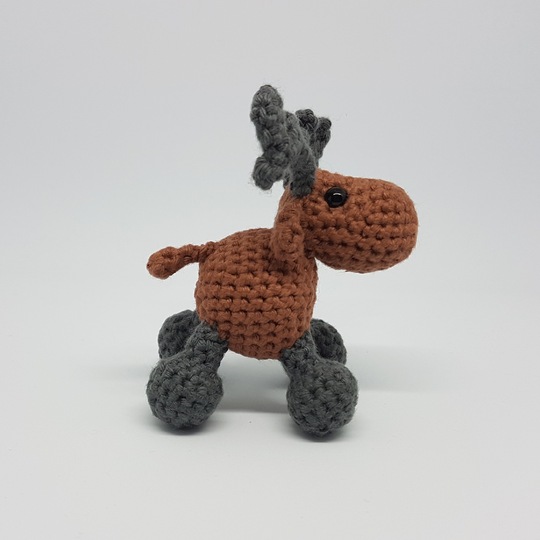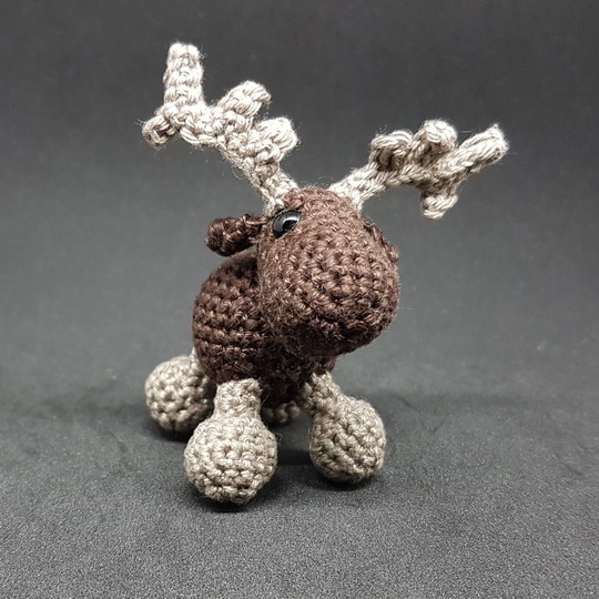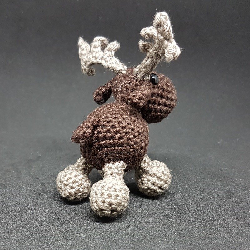 bei 50 g/115 m Schulgarn und Nadelstärke 2,5 wird der Elch ca. 9 cm hoch und 7 cm lang.
