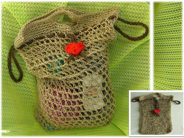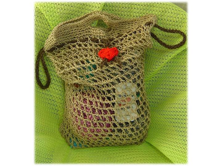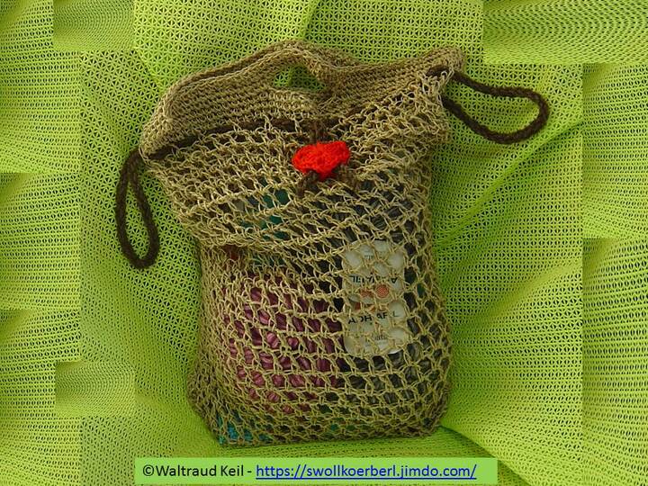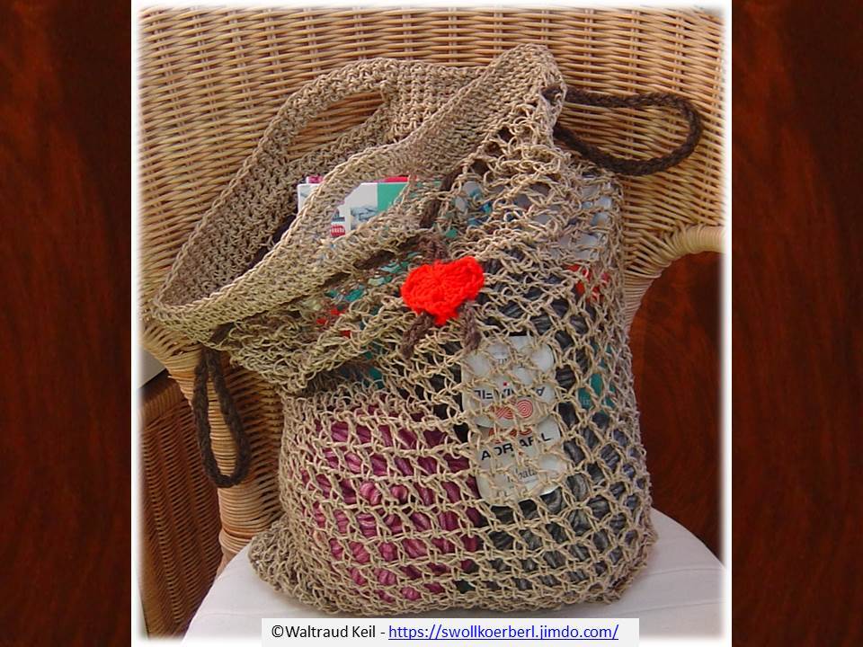 Im Zuge unserer Umwelt-Aktion 2017/2018 bei uns in Bernau am Chiemsee ist dies eine sehr naturale Einkaufsnetz-Tasche, die bei Verwendung von Paketschnur auch schwergewichtigeren Einkäufen standhält. Wer mag, kann die Tasche auch füttern.