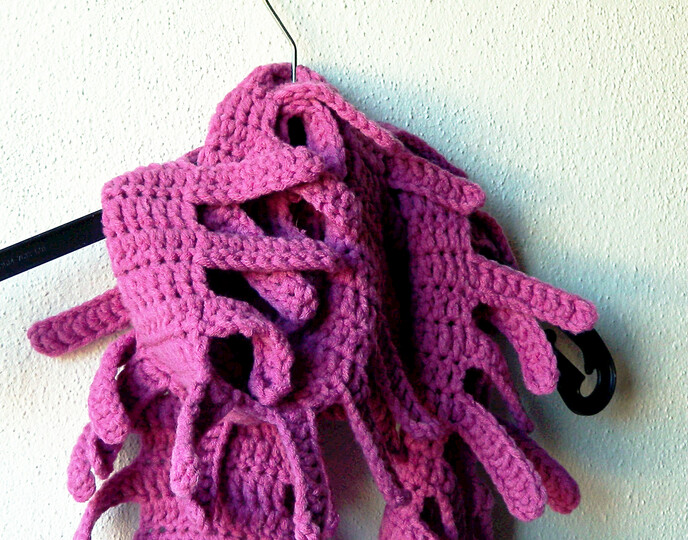 Der abgebildete Schal wurde aus Lana Grossa Mille II gehäkelt, eine sehr dicke Wolle und Polyacryl-Mischung. Irgendetwas Ähnliches sollte es sein. Meiner ist in Wirklichkeit rosa, irgenwie konnte ich die richtige Farbe nicht aufs Bild bannen. Der Schal wird in jeder beliebigen farbe cool aussehen.