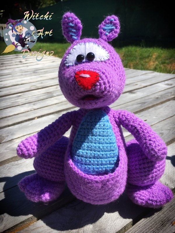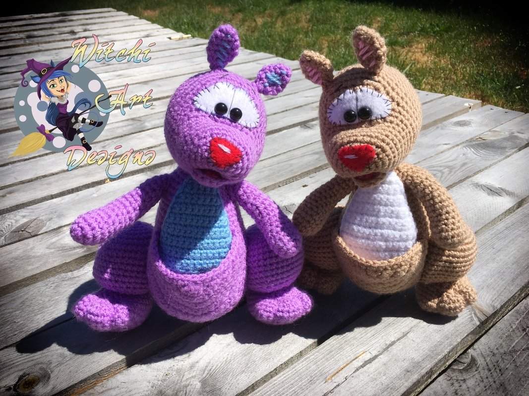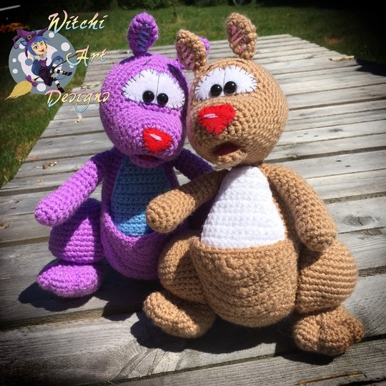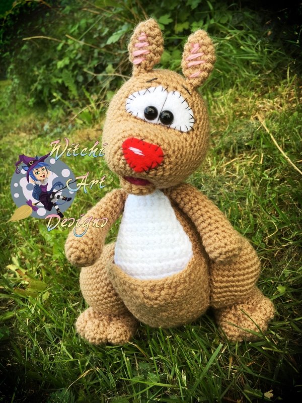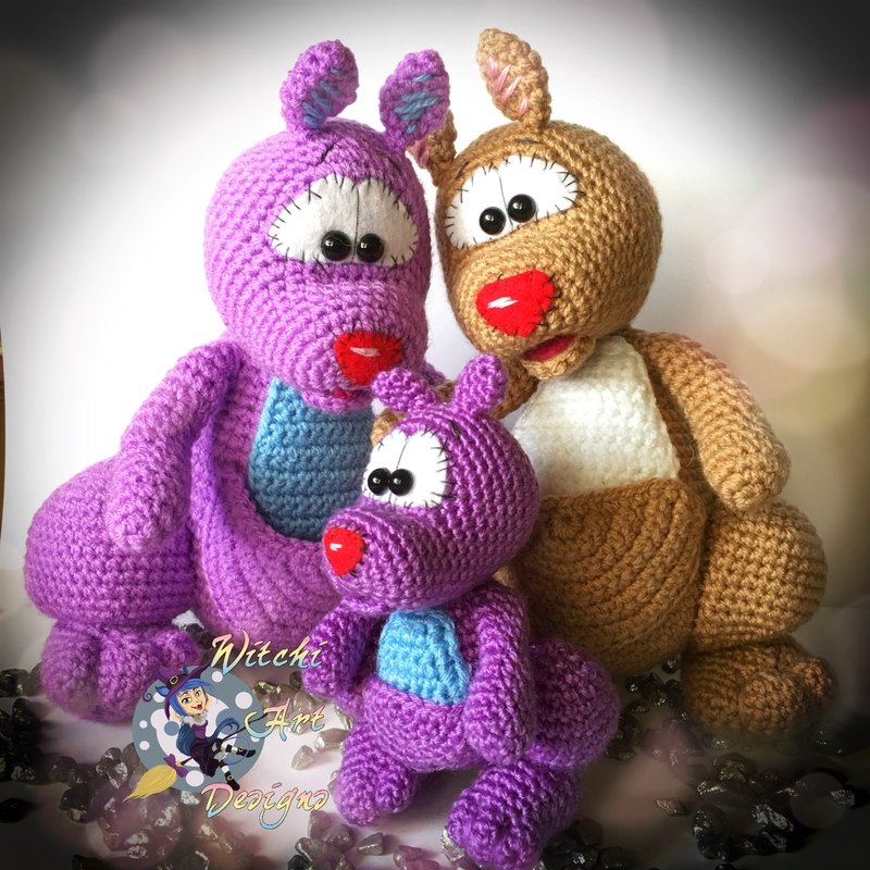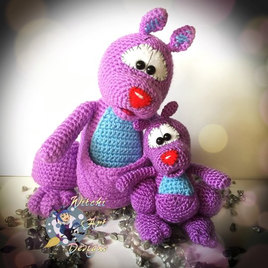 Größe entspricht etwa 9-12 cm für das Kleine und etwas 23-25 cm für das große Känguru, abhängig von der verwendeten Nadelgröße und wie fest/locker gehäkelt wird.