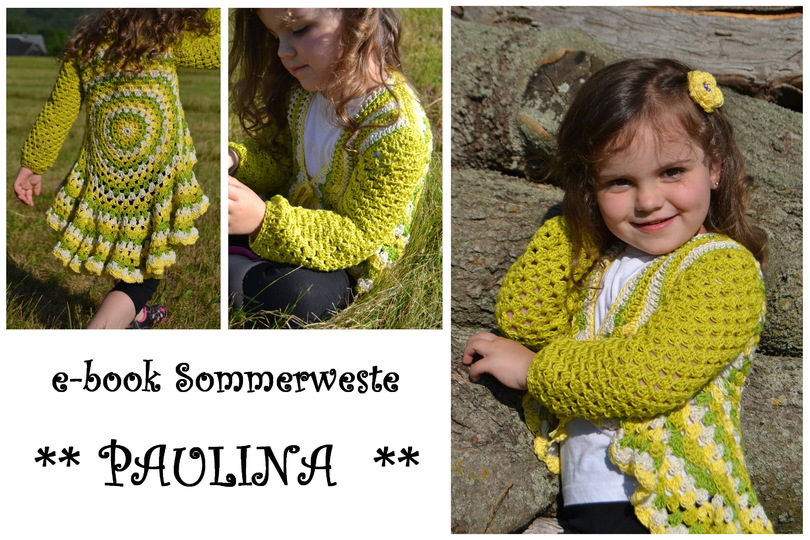 Die Häkelanleitung für die Sommerweste/Jacke PAULINA ist sehr ausführlich mit vielen Schritt für Schritt Fotos, Designbeispielen (zum Wickeln und unterschiedliche Armlängen) erklärt. Auch habe ich wieder Häkelschriften gezeichnet und einen kleinen Workshop für die wichtigsten Arbeitsschritte eingefügt.