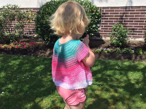 Grundsätzlich kann das Hängerchen auch als Kleidchen gehäkelt werden, dazu werden einfach mehr Runden ohne Zunahmen gehäkelt, als für das kurze Hängerchen.