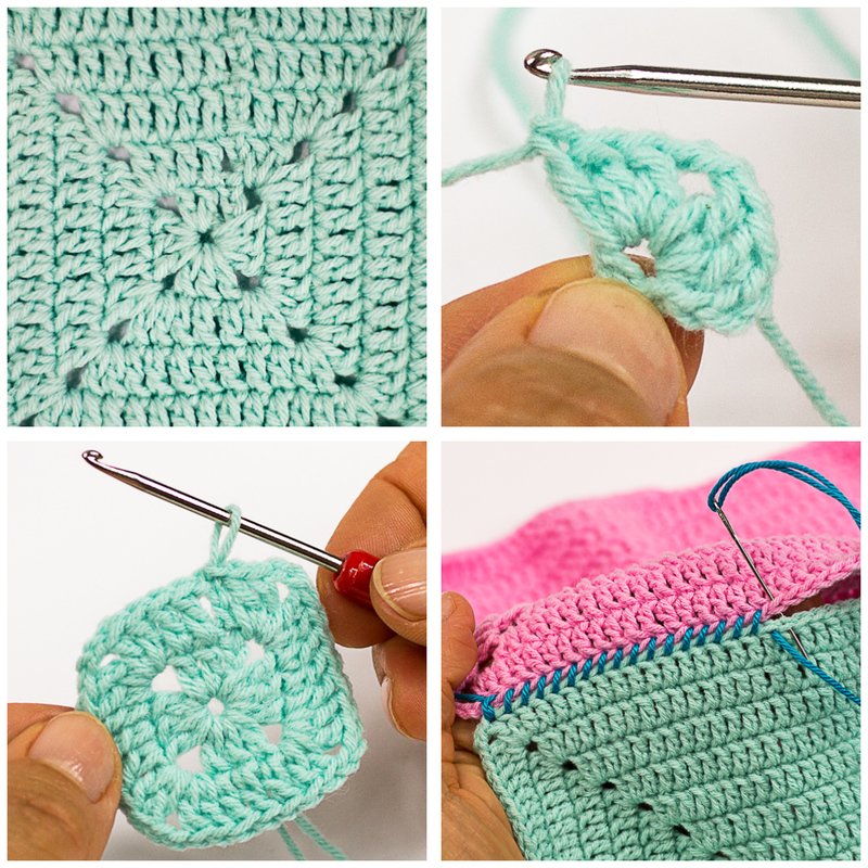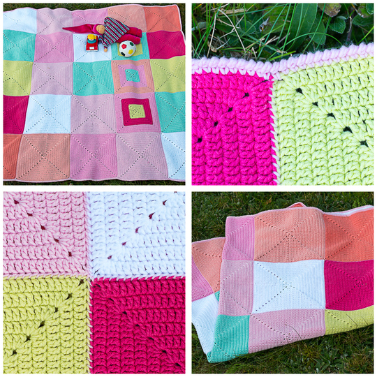 Es ist praktisch dass man jedes Quadrat einzeln häkelt, dann ist die Häkelarbeit in der Hand nicht so schwer und man kann immer ein Knäuel und eine Häkelnadel dabei haben und unterwegs auch mal ein paar Runden häkeln.