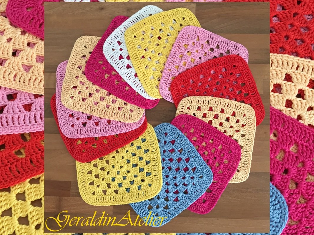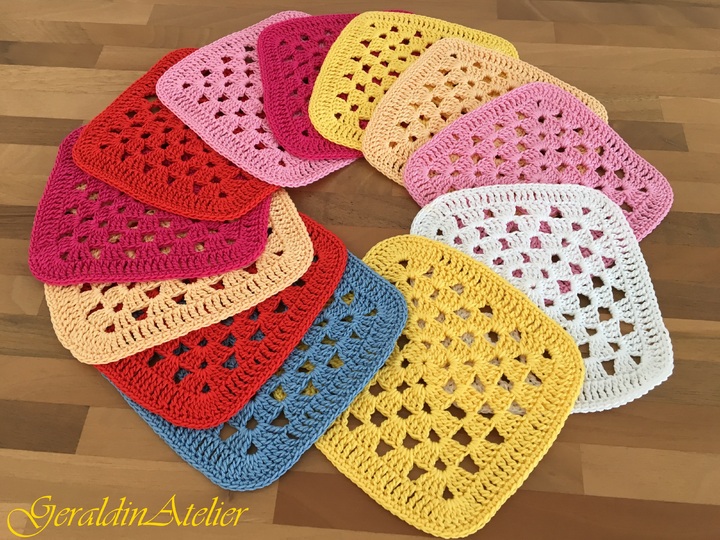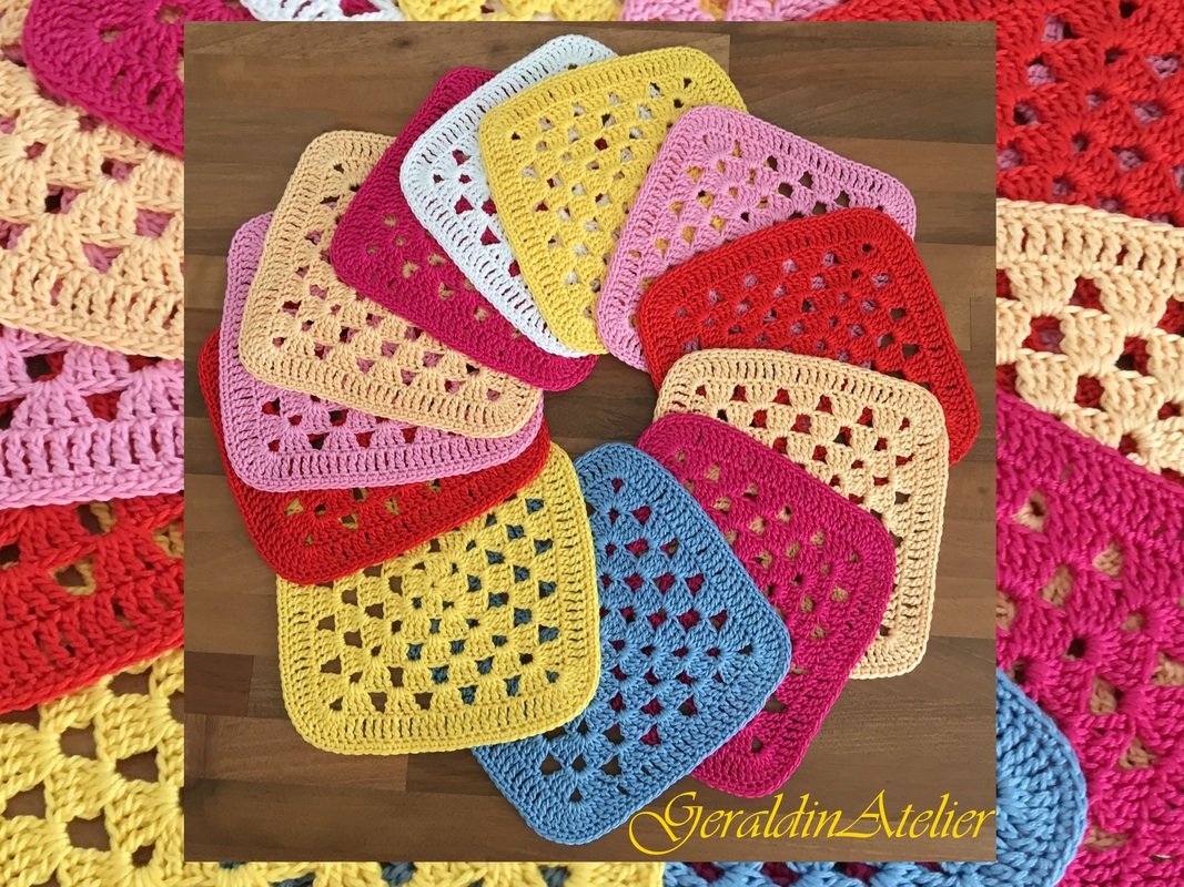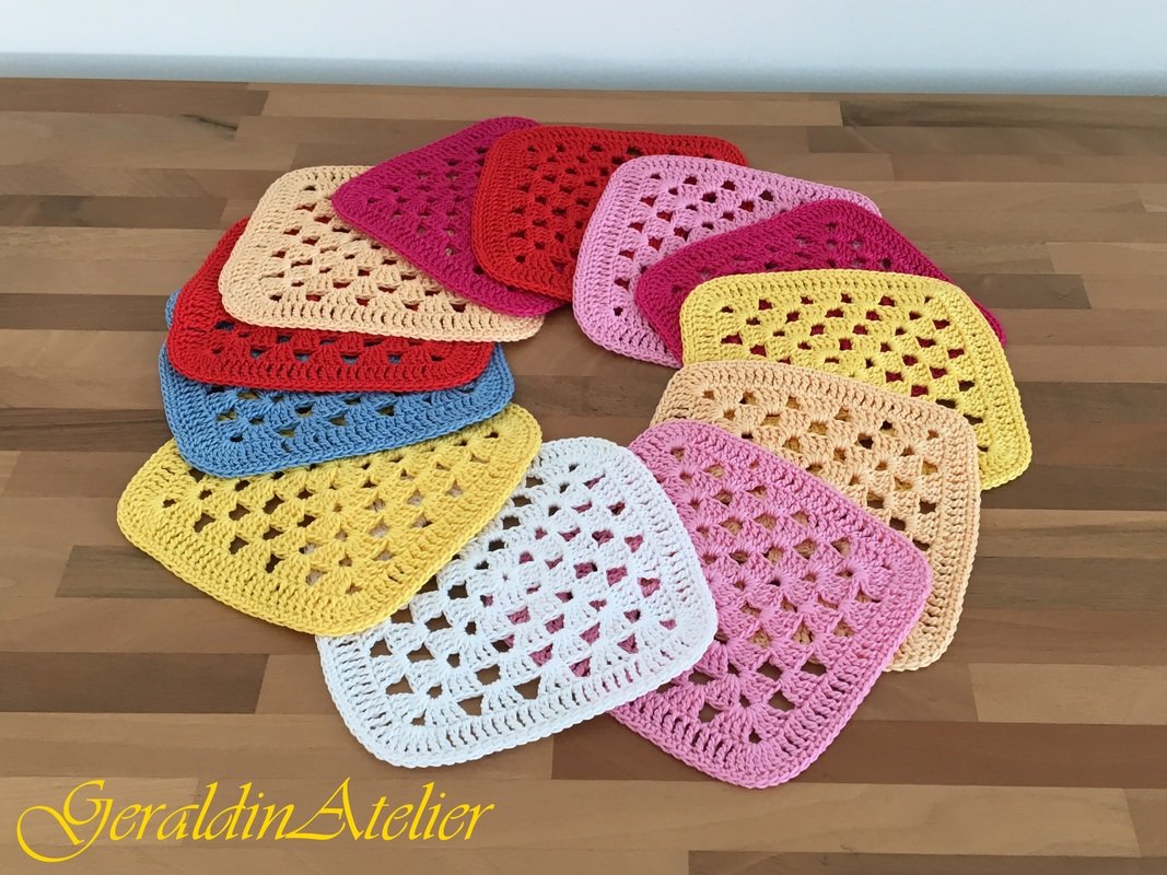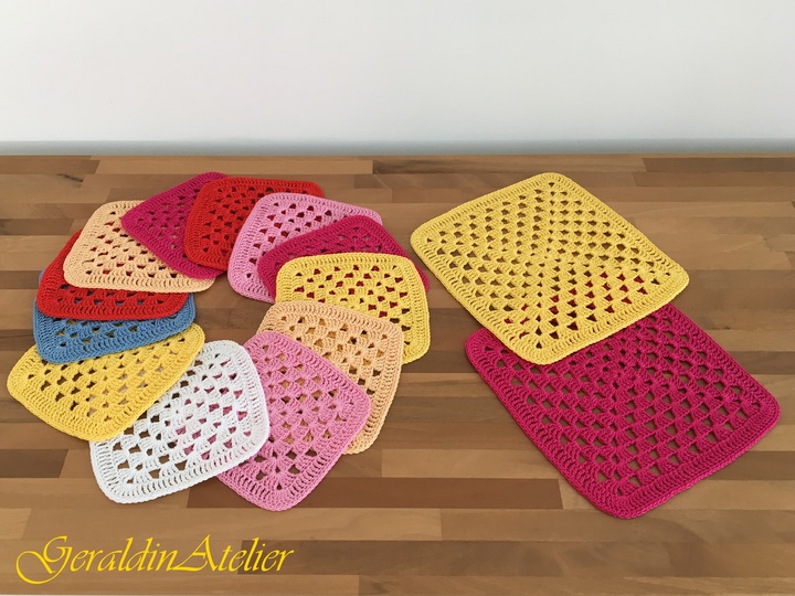 Für die 12 abgebildeten Untersetzer (Grösse: ca. 11 cm x 11 cm) wurde 94g Baumwolle gebraucht und für 2 grösseren Untersetzer (Grösse: ca. 17 cm x 17 cm ) 33g, insgesamt 127g Baumwolle.