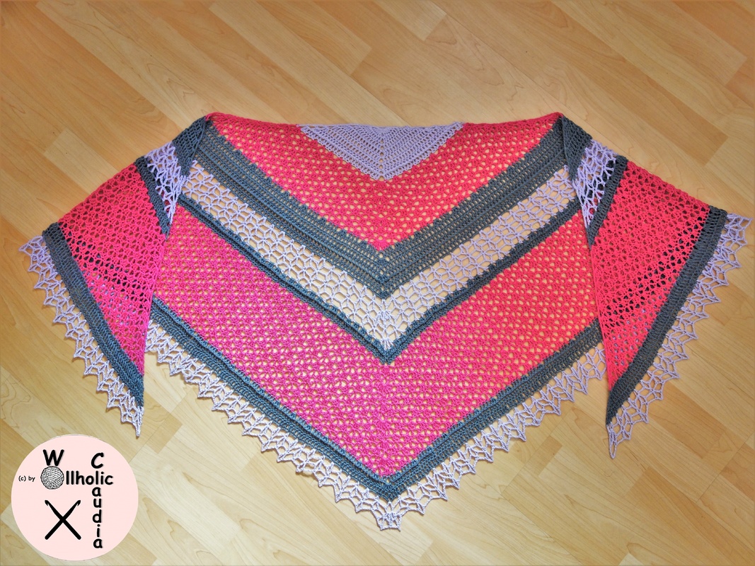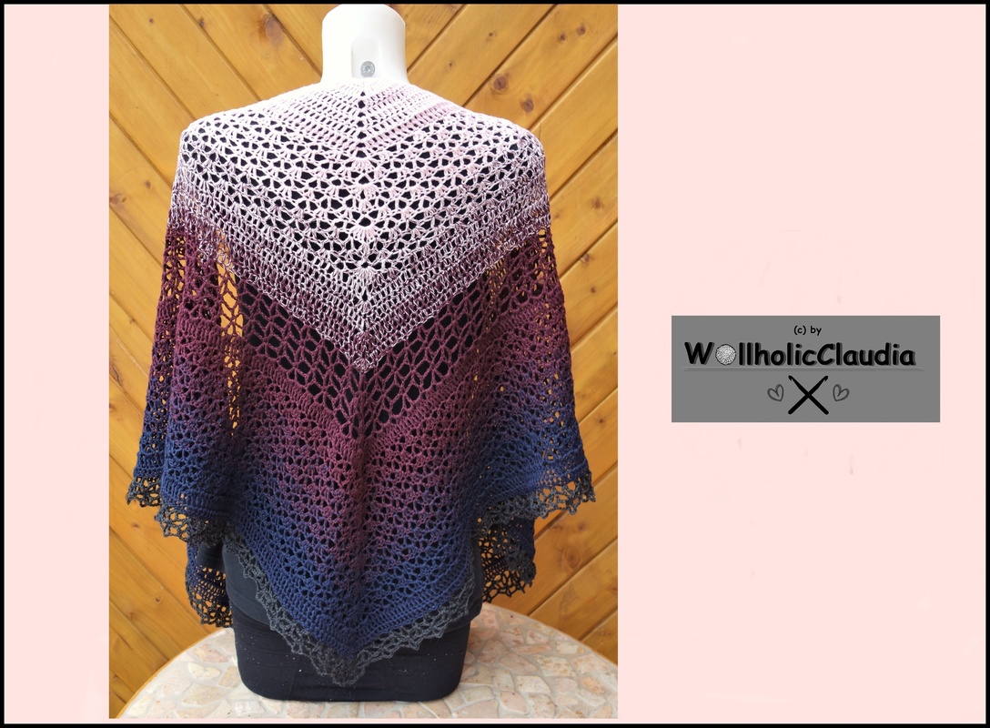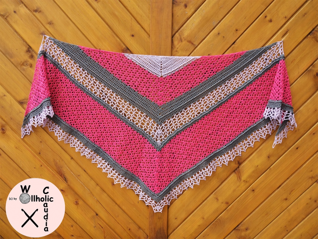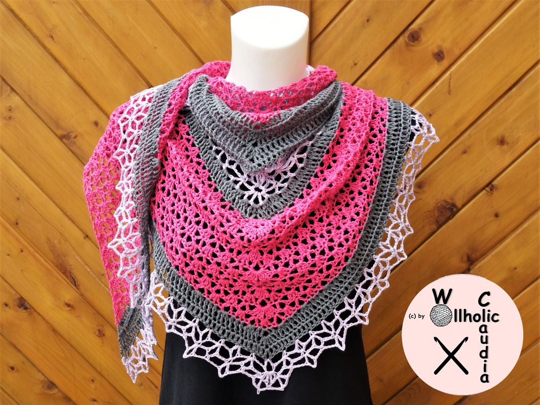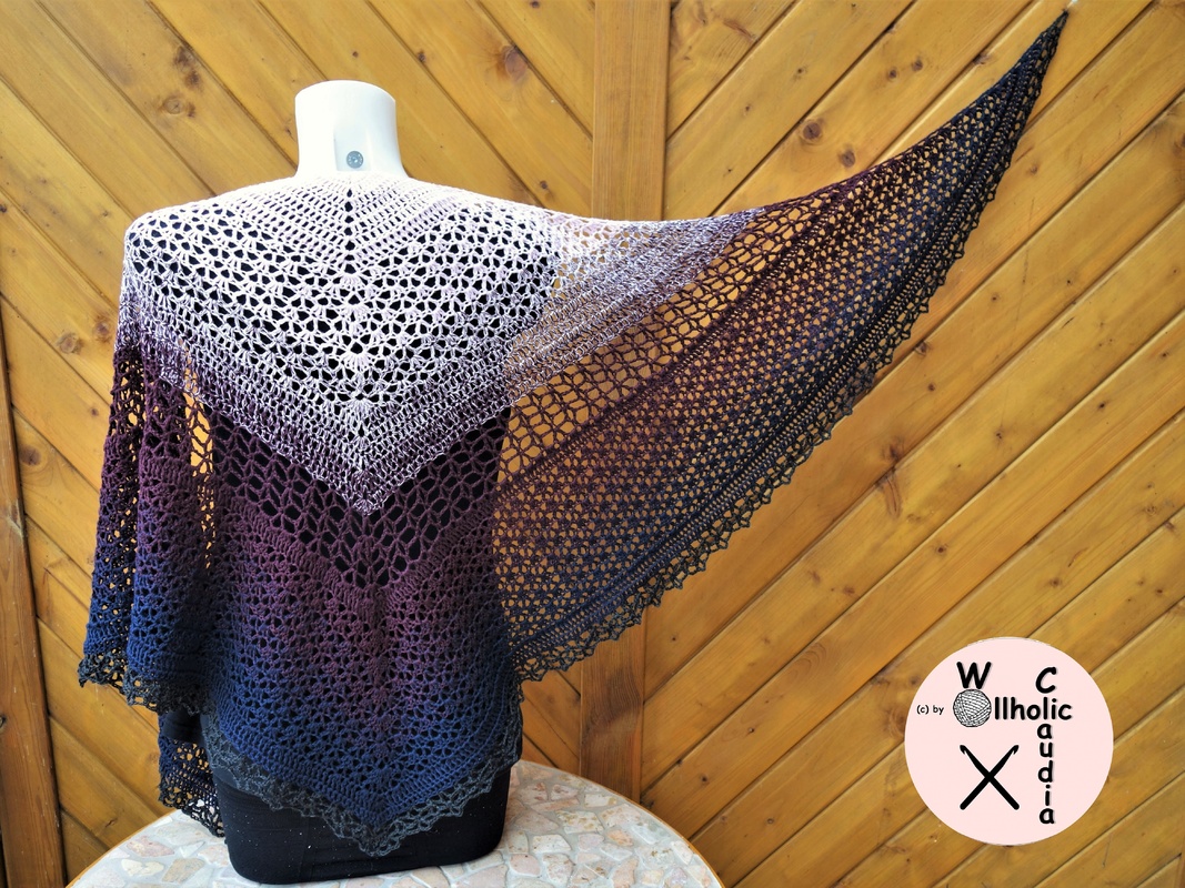 Es bietet viele verschiedene Tragemöglichkeiten, ob als Schal um den Hals, als Stola oder Schultertuch für frische Sommerabende. Das Tuch hat gespannt und bei angegebener Garn- und Nadelstärke die Maße: 1,85 m x 0,75 m. Du kannst es nach einer schriftlichen Anleitung nachhäkeln, oder aber nach Häkelschrift arbeiten.