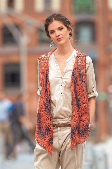 Retro gefällig? Dieses Modell sorgt garantiert für Aufsehen! Blickfang dieser attraktiven Häkelweste in warmen Orange-lila-Farbverläufen ist ohne Zweifel das große Kreismotiv und die runden Abschlüsse am Bund
