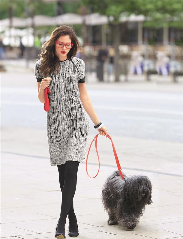 Raffiniert-einfach geschnittenes Kleid aus elastischem gemusterten Stoff mit einer Bordüre als Saumabschluss. Raglannähte und Reißverschluss geben dem Kleid die sportliche Note. Besonderer Blickfang: mit Nappalederimitat eingefassten Hals- und Ärmelabschlüsse. Der aus demselben Stoff genähte Loop ist die perfekte Ergänzung dazu.