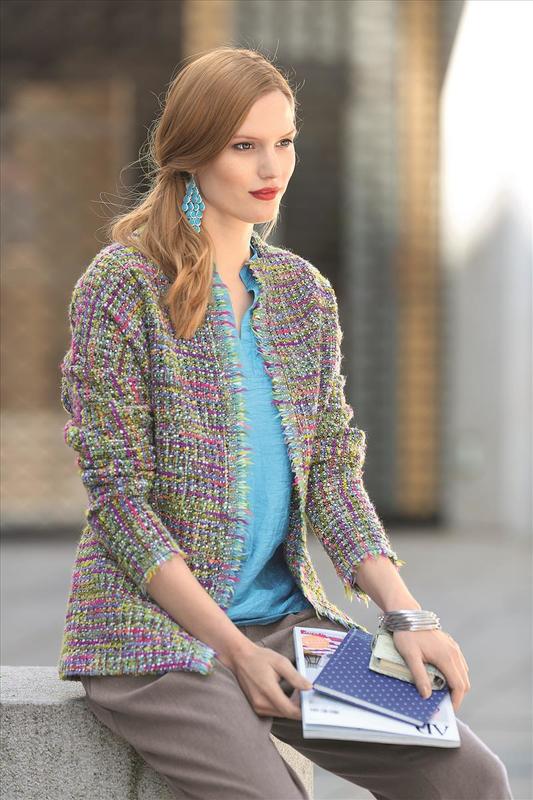 Genäht aus leichtem gemusterten Stoff mit Fransenkante besticht diese leichte Jacke durch ihre Schlichtheit. Sie hat einen kleinen Stehkragen und lässt sich mit vier großen Druckknöpfen verschließen.