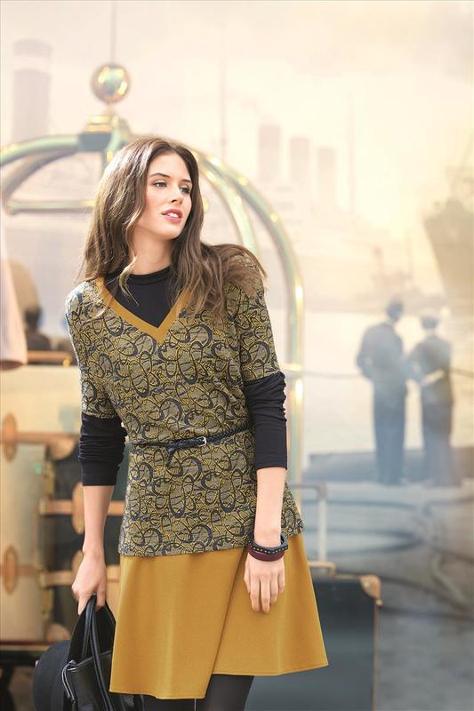 Der taillierte Pullunder aus elastischem gemusterten Stoff ist schnell genäht. Er hat Brustabnäher, kurze Ärmel und eine passende unifarbene Blende im V-Ausschnitt.