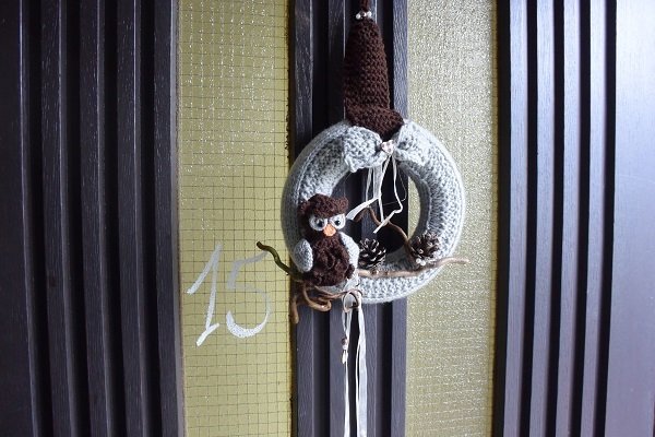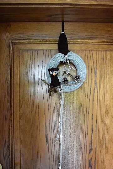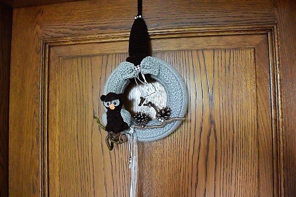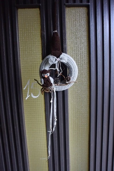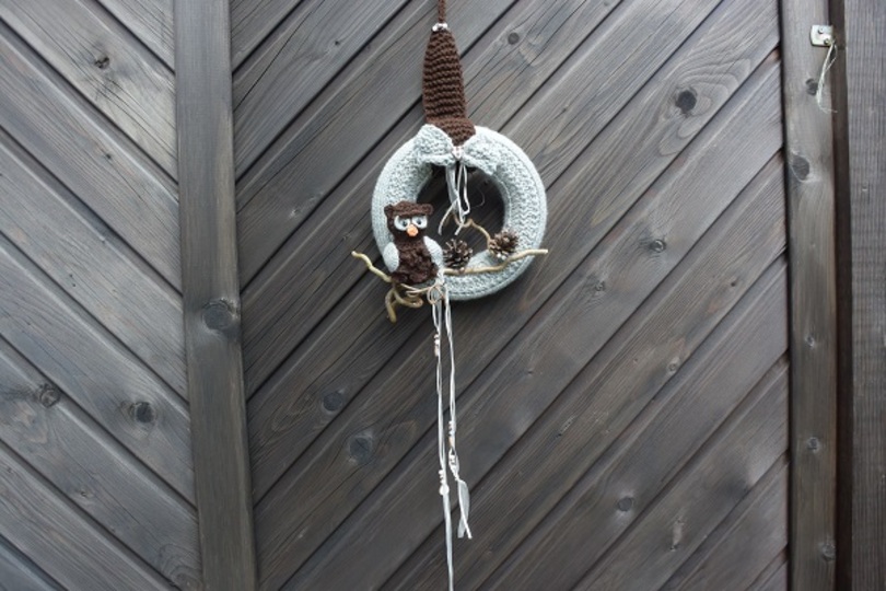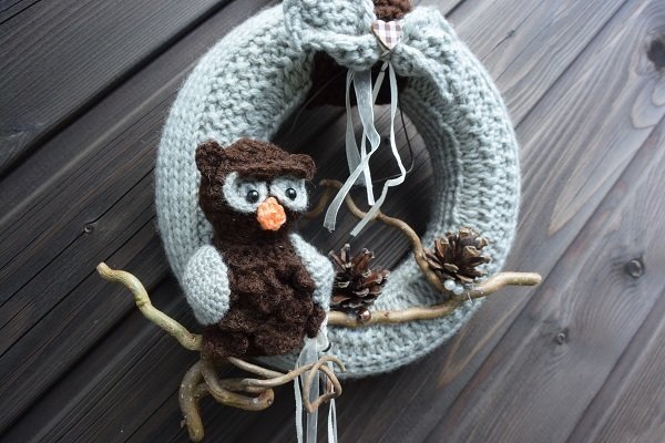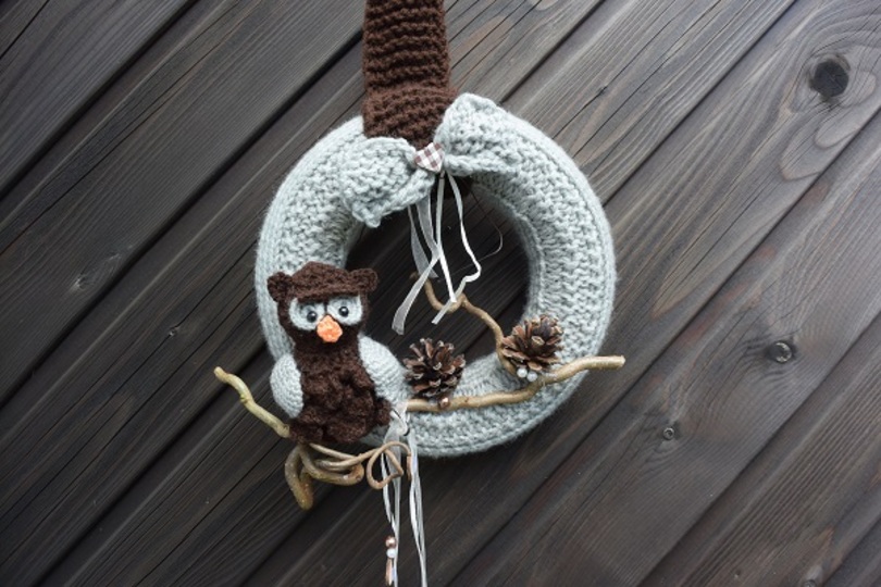 Der Kranz, Aufhänger und die Schleife werden gestrickt, die zuckersüße Eule die deinen Eingangsbereich bewachen wird, ist gehäkelt.