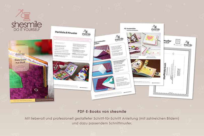 PDF-E-Books von shesmile: Diese leicht verständliche Schritt-für-Schritt-Anleitung mit vielen Fotos ist auch für Nähanfänger geeignet, denn die sehr ausführliche Fotoanleitungen begleitet dich bei jedem Schritt.