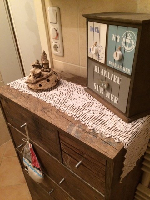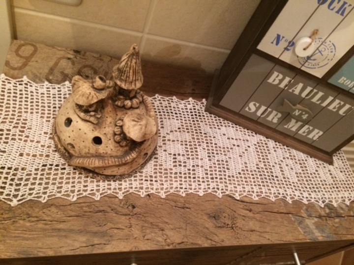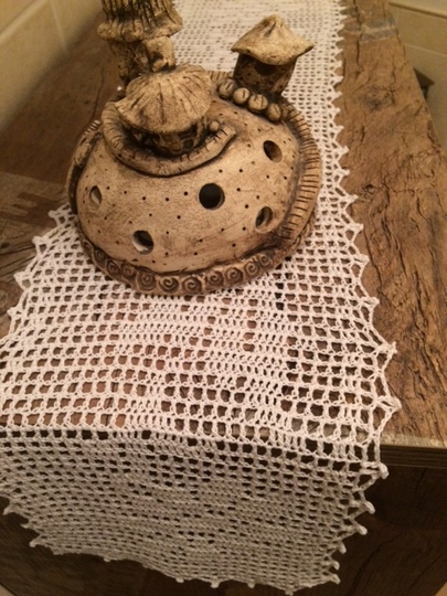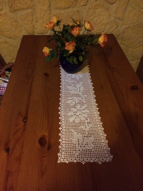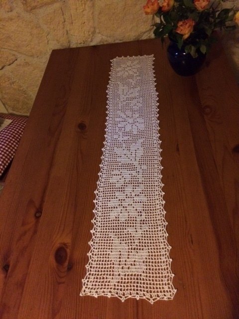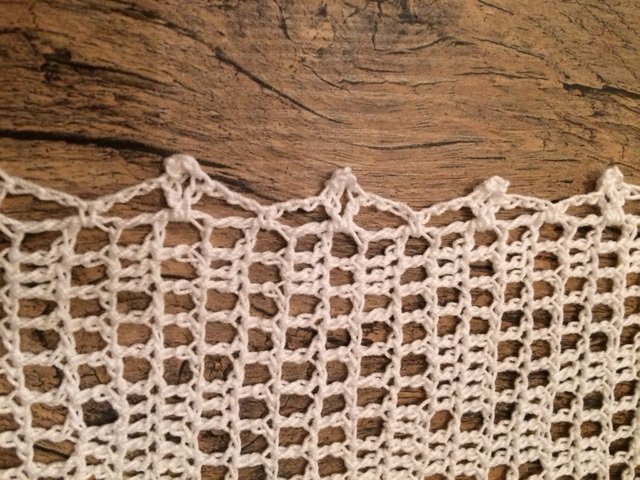 Gehäkelt wird mit Luftmaschen und Stäbchen, die Umrandung wird mit Luftmaschen, Stäbchen und festen Maschen gearbeitet.