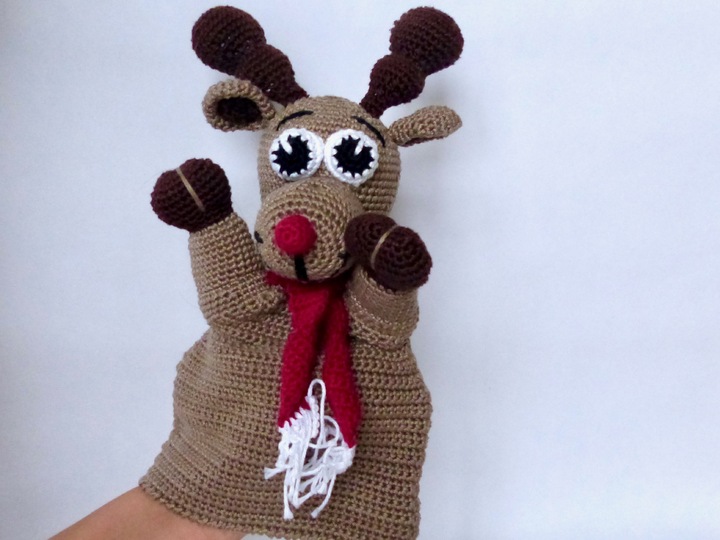 Rudolph - The Red Nosed Elch sollte eigentlich ein ganz normaler Elch werden - dann kam die Weihnachtszeit, da bot sich eine rote Nase an und nun ist er eine Kombifigur aus Rentier und Elch :) Sie passt als Handpuppe auf jede Hand (da die Armlängen nach Bedarf angepasst werden können) und wird so zum Leben erweckt.