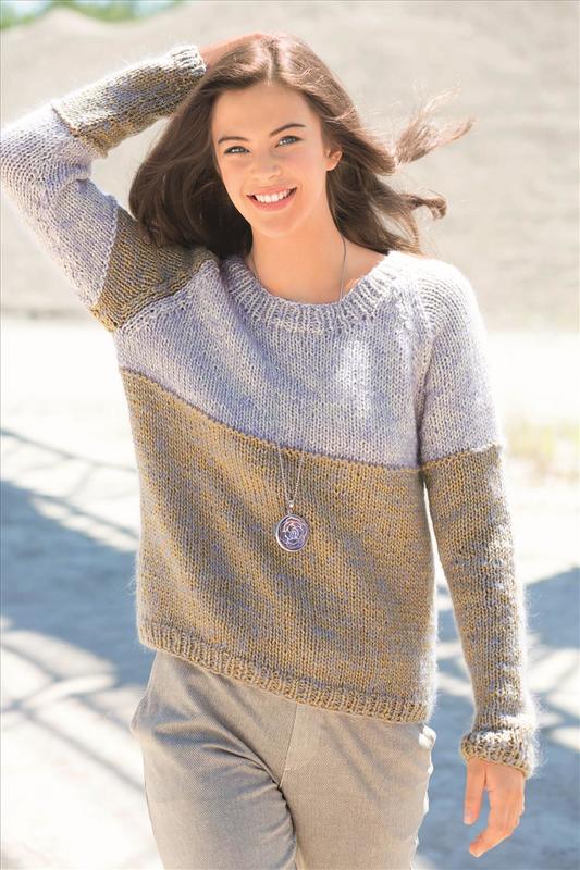 Colourblocking kann so einfach sein. Dies zeigt auf beeindruckende Art der zweifarbige Raglanpulli, der durch mitlaufendes Mohairgarn seinen dezenten Melange-Effekt erhält.