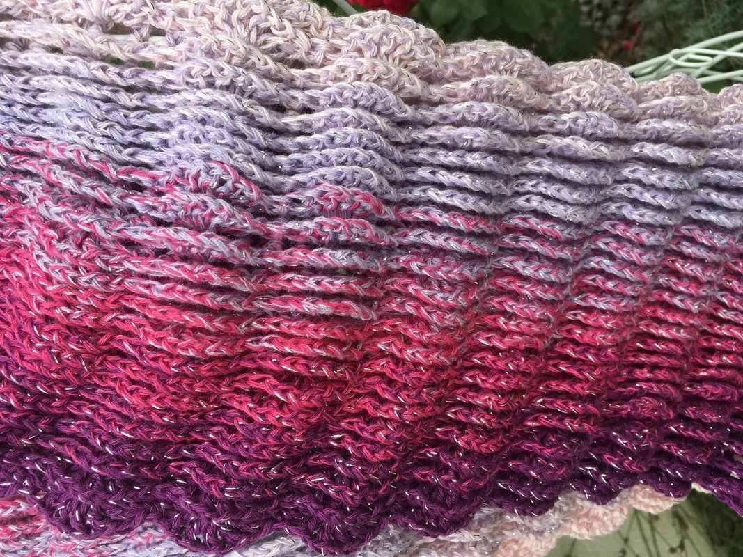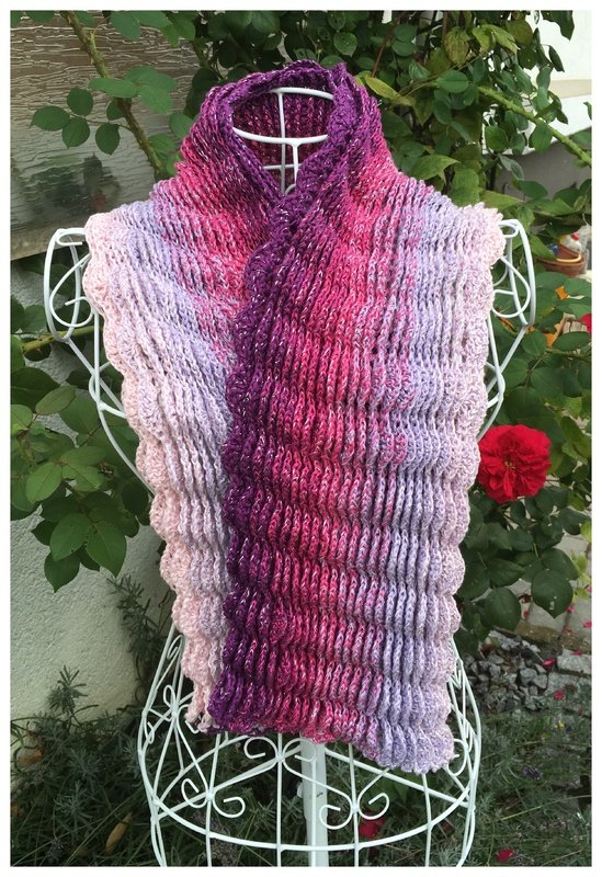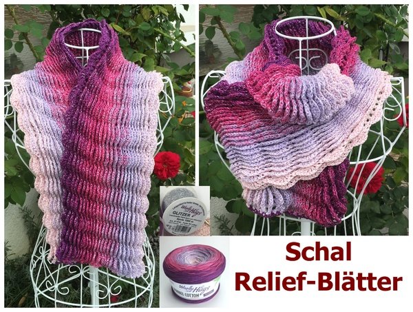 Dieser Schal eignet sich prima für Mantel und Jacke - er deckt den Ausschnitt am Hals ab und blitzt gleichzeitig als Hingucker hervor. Das Muster ist so aufgebaut, dass sich die Relief-Blätter bei Bewegung leicht öffnen. Der Glitzerfaden läuft als Beilaufgarn mit - was den aha-Effekt beim Bewegen zusätzlich noch erhöht.