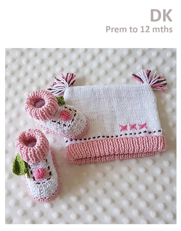 Booties & Beanie: 1 x 100g balls of 5 colors of DK yarn (booties will use approximately 25g)