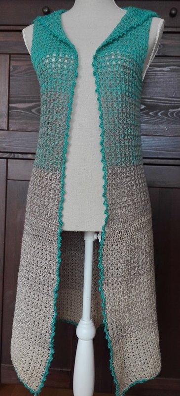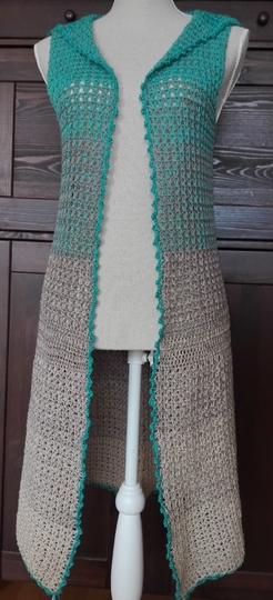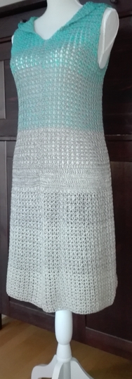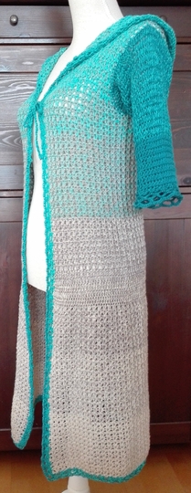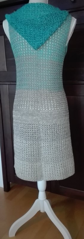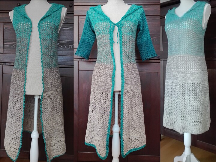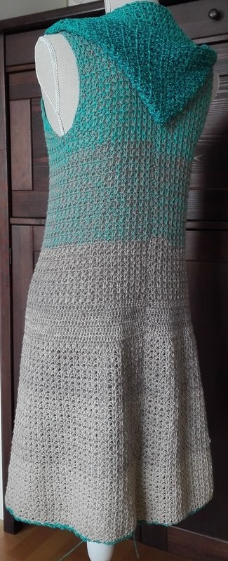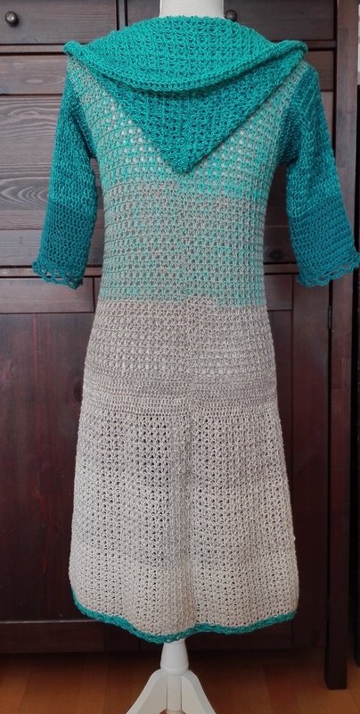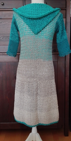 Häkelanleitung für ein schlichtes ärmelloses Kleid mit Kapuze, eine lange Weste mit Kapuze und schmaler Zierblende für die Größen S-L oder einen Mantel mit halbem Arm für die Größe S. Der Mantel eignet sich auch hervorragend als Morgenmantel.