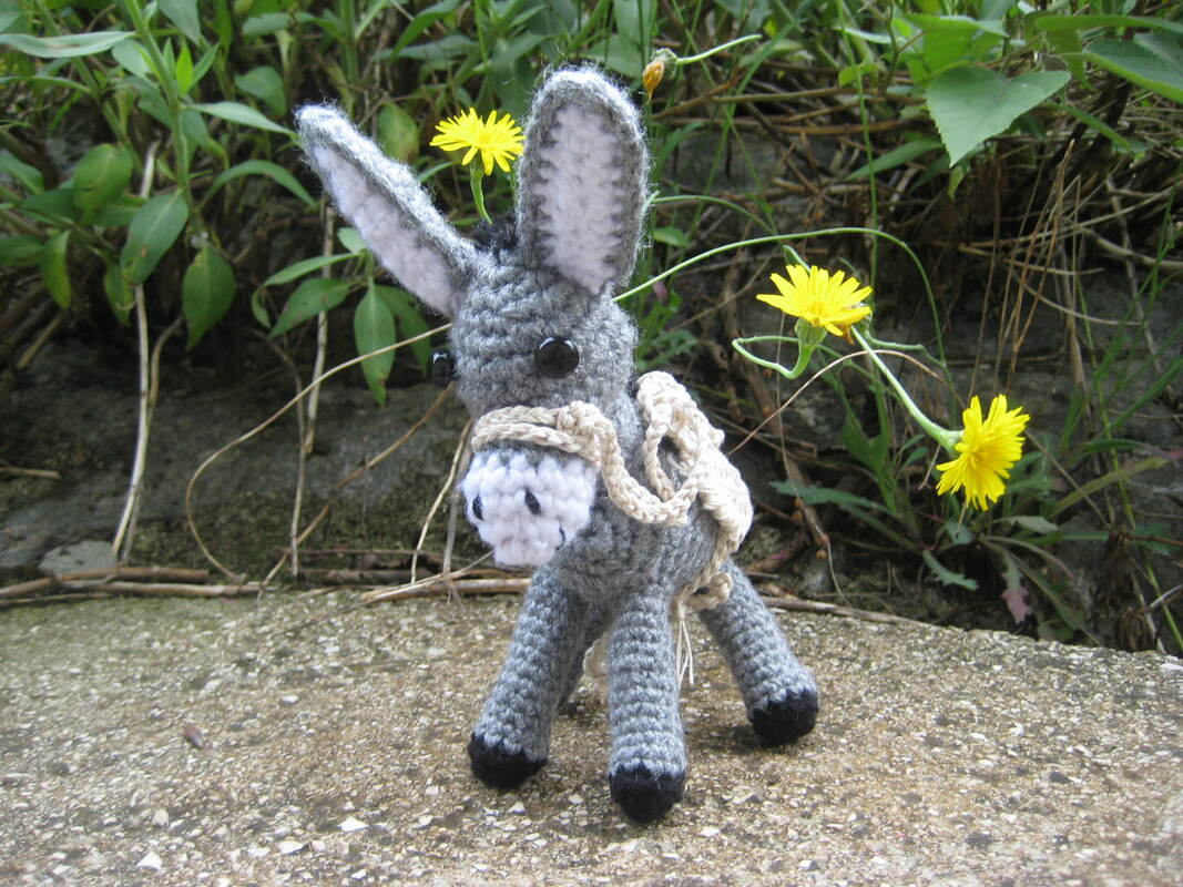 Dimensions of this donkey are 23 cm (9 inch) tall (counting the ears).and 16 cm (6 inch) length from head to tail. If you want smaller or bigger donkey just use thinner or thicker yarn