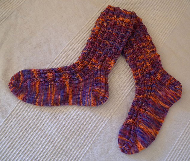 Dieses Sockenmuster wurde mit dem Hintergedanken entworfen, handgefärbte Sockenwollen zur Geltung zu bringen. Selbstverständlich kann man auch andere Garne verwenden.