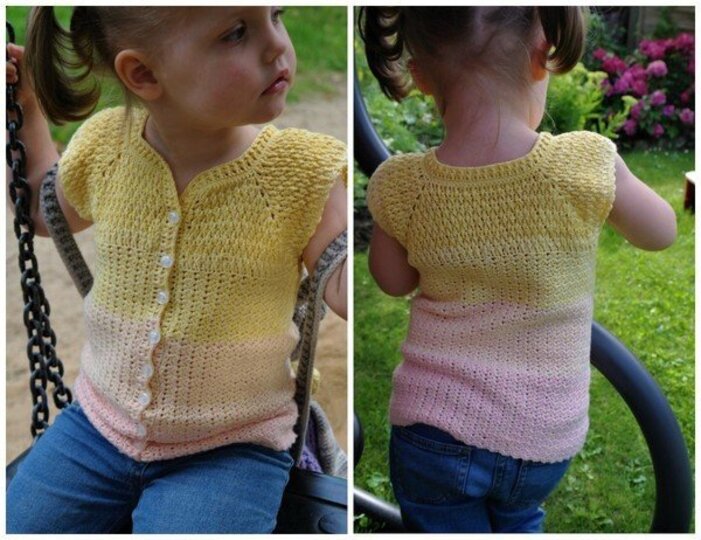 Weste/Kurzarmjacke wird von oben nach unten gehäkelt so, dass die jeder Größe individuell angepasst werden kann.