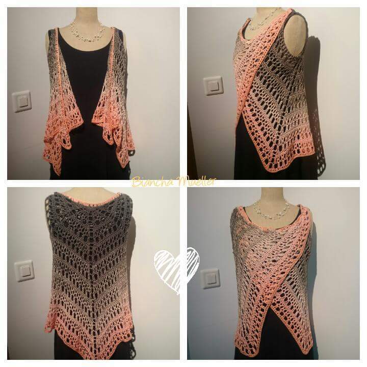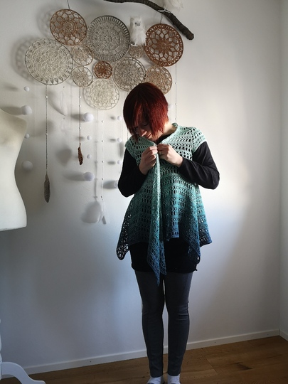 Die Weste wird an einem Stück von oben nach unten gearbeitet. Sie sieht offen oder geschlossen getragen speziell aus und ist ein Hingucker.