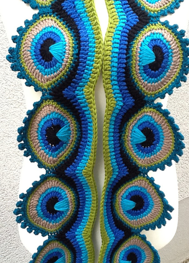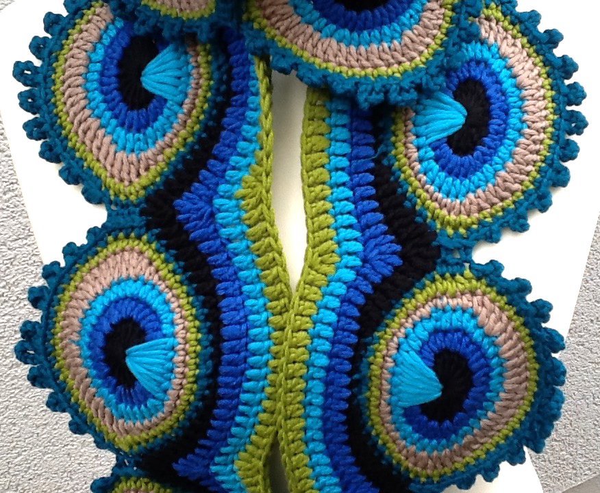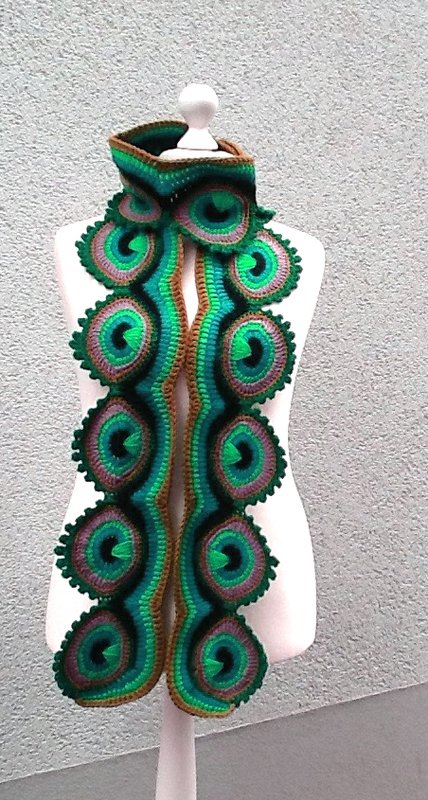 Der schöne Schal PFAU ist eine wundervolle Handarbeit die richtig Freude macht. Es sieht auch von weitem sehr stylisch aus. Bitte damit NICHT in den ZOO gehen, denn die Pfauen werden sonst zu neidisch!