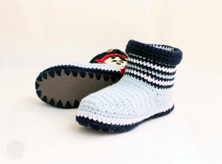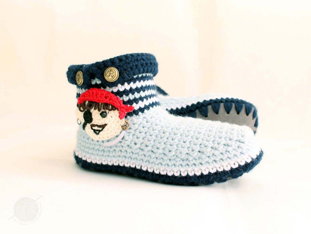 Die PDF-Häkelanleitung besteht aus bebilderter Anleitung zum Häkeln von Hüttenschuhe mit Filzsohle. Die Hüttenschuhe werden mit Applikation "Pirat" dekoriert. Hüttenschuhe sind eine perfekte Alternative zu Hausschuhe. Die sind sehr weich und daher sehr bequem für die Kinderfüße.