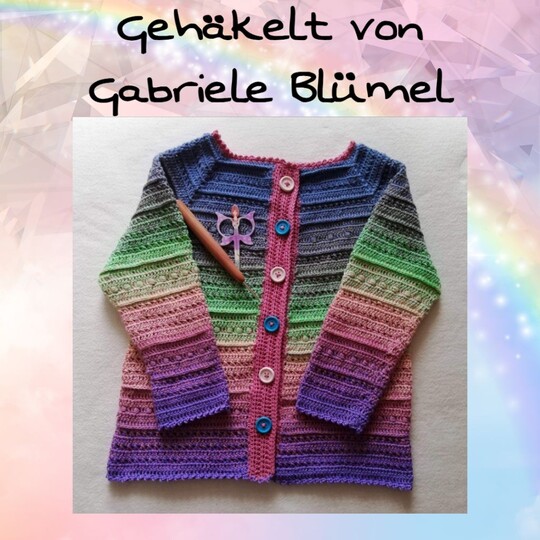 Die Anleitung ist auf 17 Seiten sehr detailliert geschrieben, Das Prinzip des RVO (Raglan von oben) ist erklärt, eine Größentabelle und die dazugehörigen Häkelschriften sind in der Anleitung enthalten, somit können geübte Häklerinnen das Jäckchen auch in der gewünschten Größe nachhäkeln.