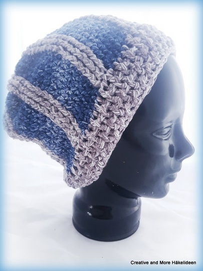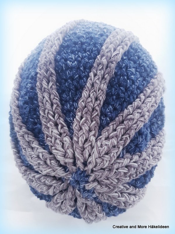 Diese Beanie fällt durch ihre farblich grau abgesetzten Reliefmaschen besonders ins Auge und pimpt das klassische Blau gekonnt auf. Wenn man die Mütze in Runden häkelt, entsteht dieser leichte "Wirbeleffekt".