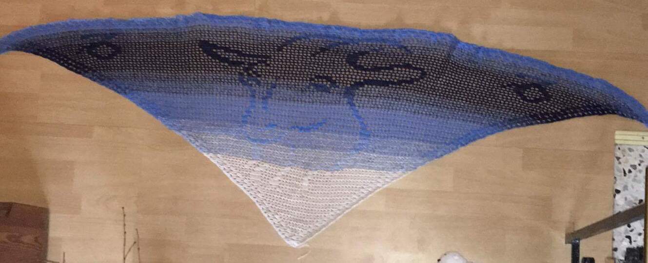 Das Motivtuch wurde mit einem 3 fädigen Farbverlaufsgarn gehäkelt. Verwendet wurden ca. 900 Meter. Damit hat das Tuch eine Größe von etwa 210x65 cm.