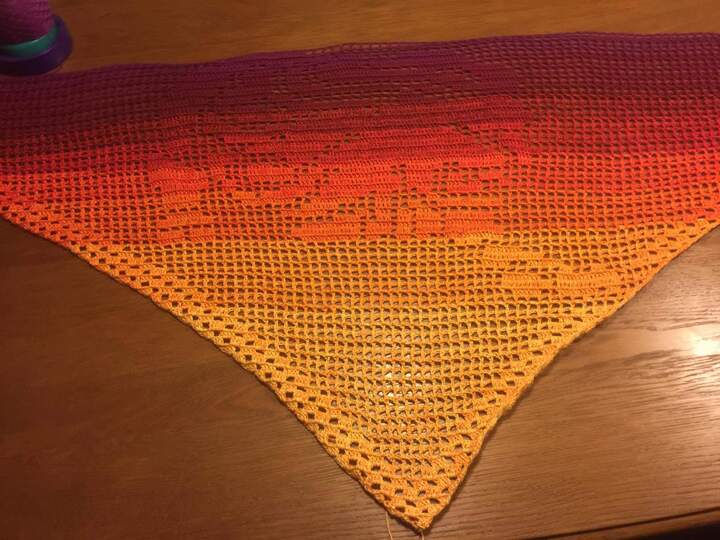 Das Motivtuch wurde mit einem 3 fädigen Farbverlaufsgarn gehäkelt. Verwendet wurden ca. 950 Meter. Damit hat das Tuch eine Größe von etwa 263x83 cm.