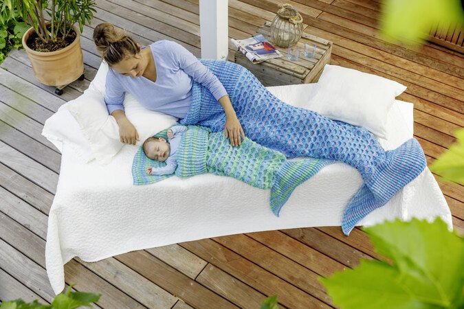 Die Meerjungfrauen-Decken für Mama und Kind laden zum gemeinsamen Kuscheln ein. Die Decken zum hineinschlüpfen sind im Patentmuster gestrickt. Das Kinder Modell ist sogar mitwachsfähig.