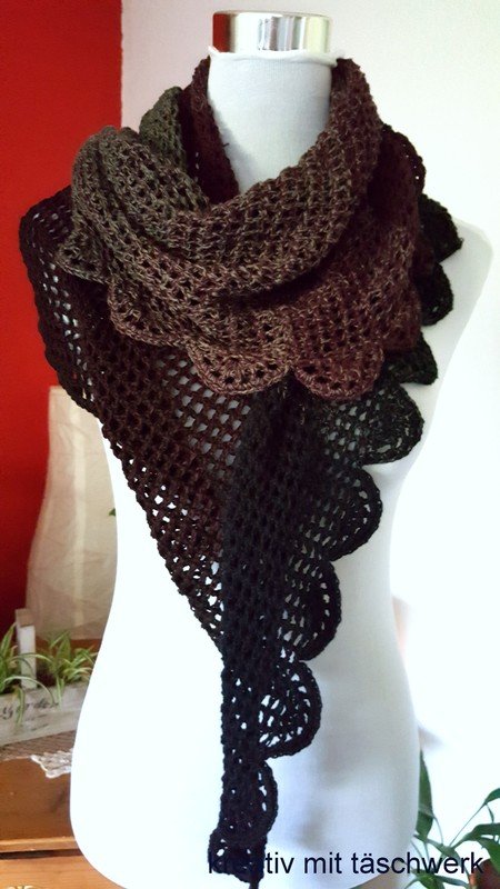 Super einfacher Drachenschwanz mit toller Borde! Das Schöne ist, die Borde wird direkt mit an den Rand der Stola gehäkelt. Wir fangen ganz klein an der Spitze an und werden immer länger und breiter. Die Bögen werden direkt mit den Reihen dran gehäkelt. In einer genau bebilderten Anleitung wird die Arbeitsweise genau beschrieben.Natürlich findet Ihr auch eine Häkelschrift und eine Beschreibung in Textform.
