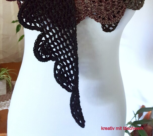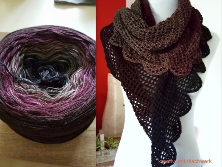 Die Stola ist ganz gut für Farbverlaufsgarn (Bobbel) geeignet. Es kann aber auch jedes andere Garn benutzt werden.
