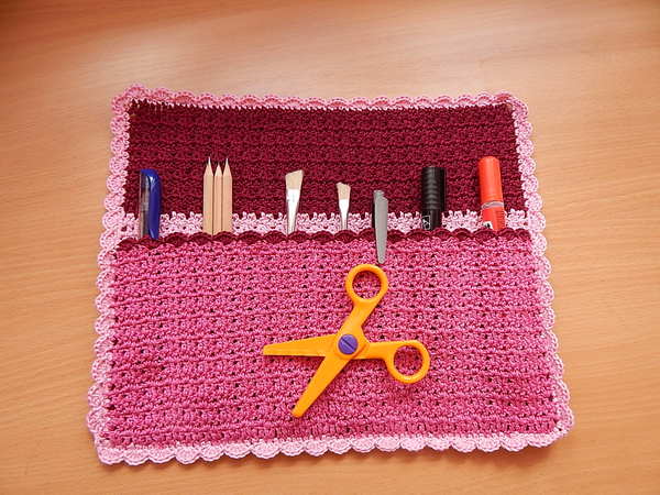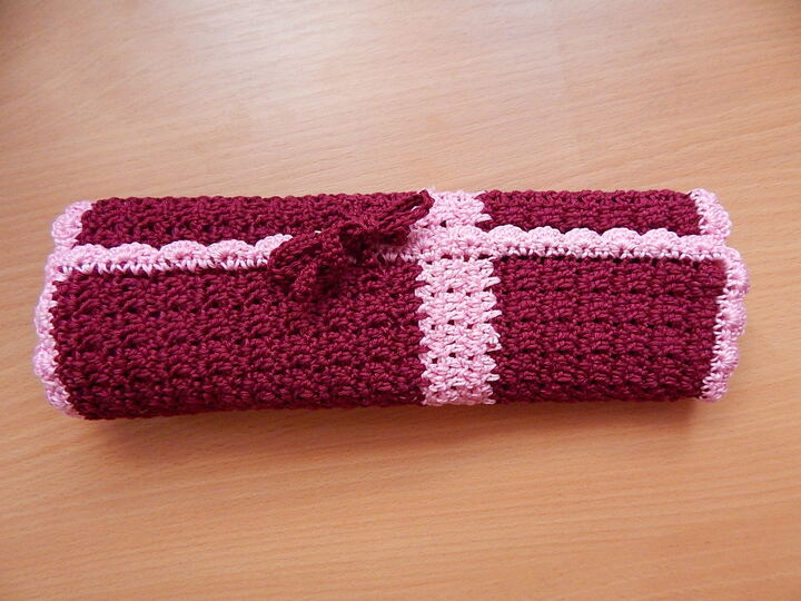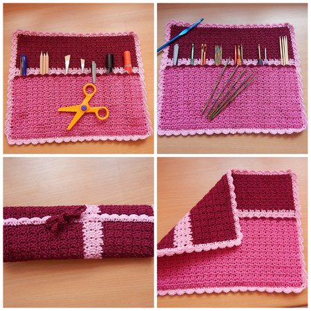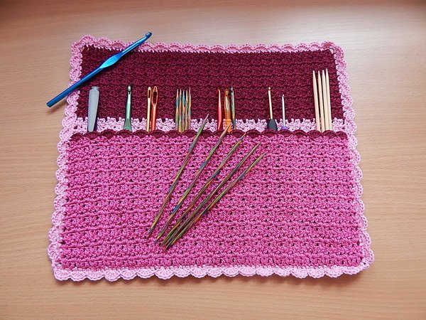 Die Häkelnadeln liegen in einem Kistchen, wenn man mal eine bestimmte Stärke braucht findet man sie nicht. Einstecken, zusammenrollen, fertig.