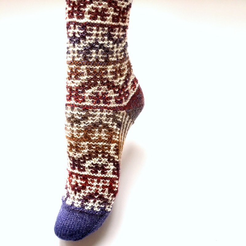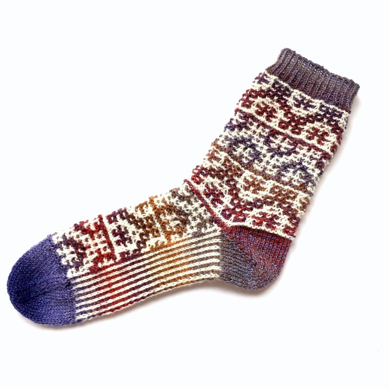 Mit diesen Socken, in Mosaiktechnik gestrickt, liegst du voll im Trend. Hebemaschenmuster sind in diesem Herbst angesagt! Die Socken sind einfacher zu stricken als du denkst. Es wird immer nur mit einer Farbe über 2 Runden gestrickt – das können auch Anfänger.
