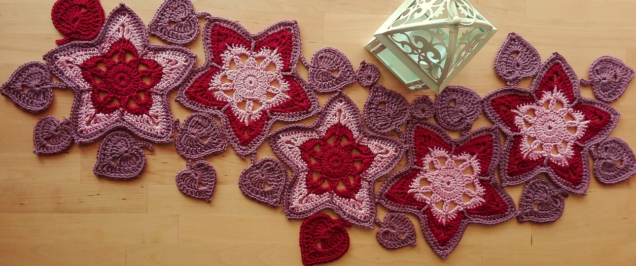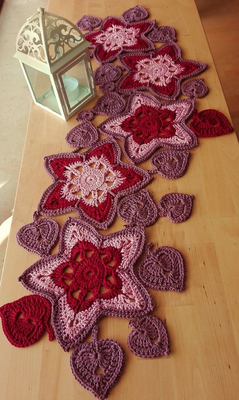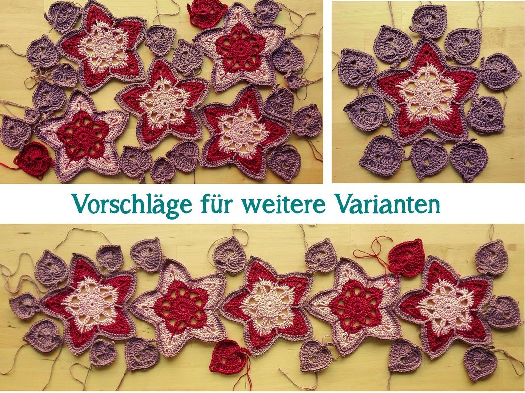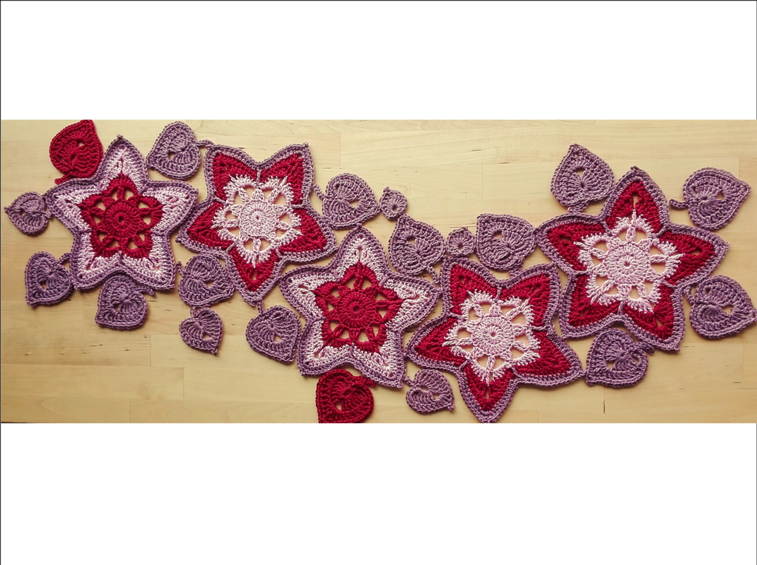 Der Tischläufer besteht aus 4 verschiedenen Elementen: einer Blume/Stern und 3 unterschiedlich großen Blättern. Je nachdem, ob Du Deinen Läufer so gestalten möchtest wie ich oder ob Du die Elemente ganz anders nach Deinen eigenen Ideen zu einer Fläche zusammen fügst - länger, kürzer, rund als Tischdecke usw. - kannst Du die Menge der Einzelelemente selbst bestimmen.