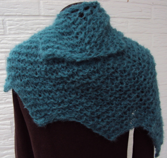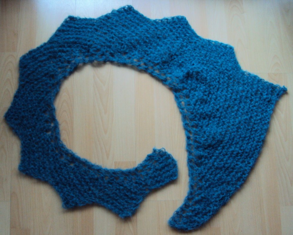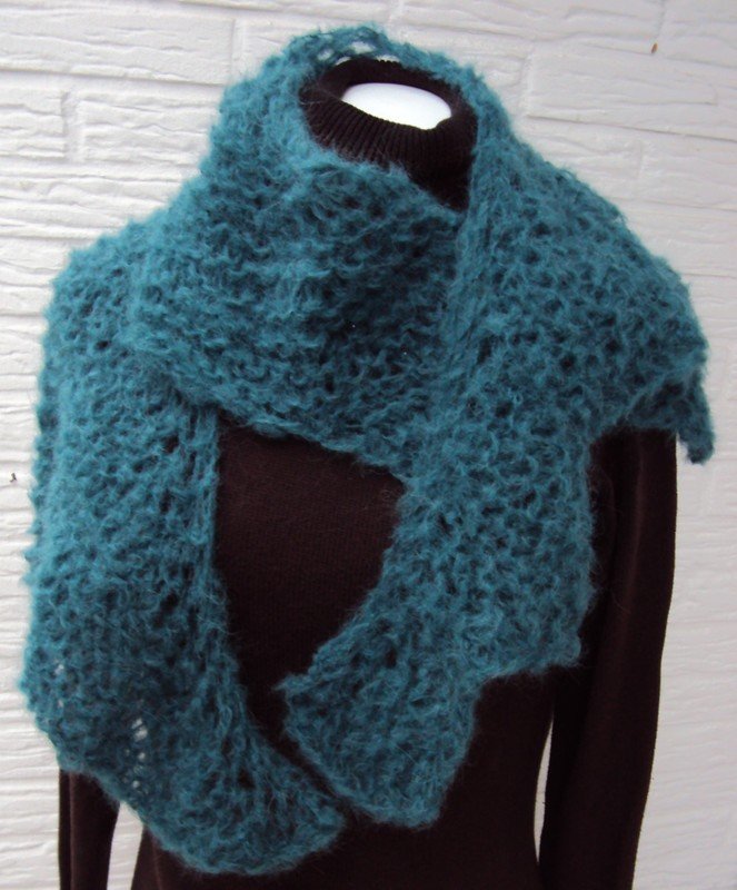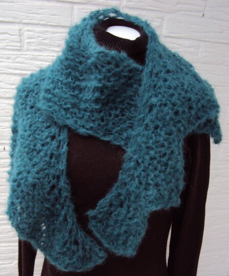 Dieser Schal wird mit Zacken an einer Kante gestrickt. Mit Nadeln Nr. 9 und nur einem Knäul von der voluminösen Alpakawolle ensteht an einem Abend dieser kuschlig warme Schal. Der Schal wird ca. 190 cm lang und 70 cm breit an der breitesten Stelle. Durch die asymetrische Form lässt sich der Schal schön drapieren.