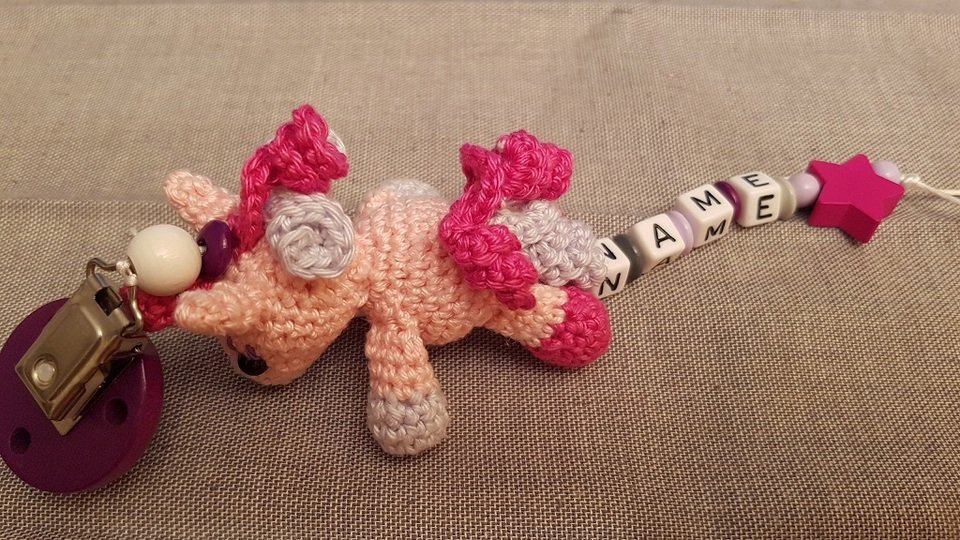 Materialliste: 100 % Baumwolle (125m/50g) in deinen Wunschfarben Schnullerkettenclip, Schnur, Holzperlen. Füllwatte