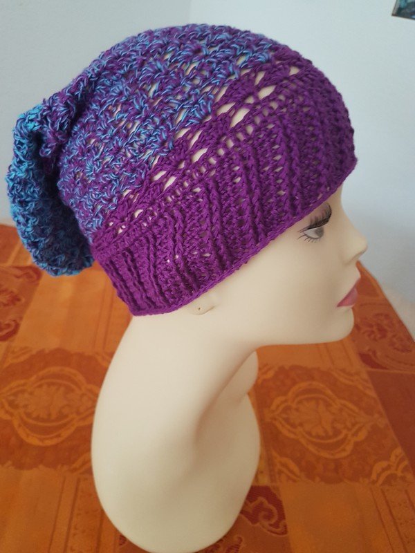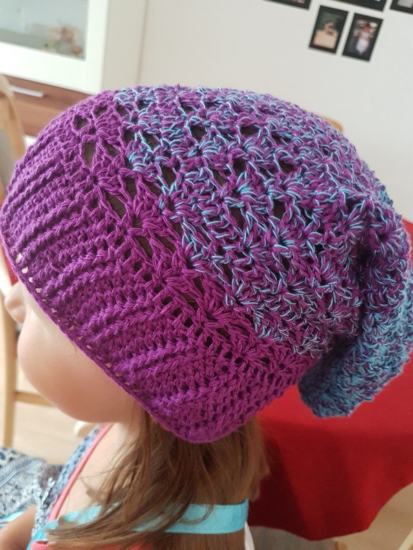 Bei einem 3 fädigen Bobbel und einer Nadelstärke von 3 benötigt man bei Kopfgröße 53 cm ca. 230 m Lauflänge und bei Kopfumfang 58 cm ca. 250 m je nachdem wie fest oder locker man häkelt und wie lang man die Mütze machen möchte. Man kann auch anderes Garn verwenden. Die Mütze wird von unten nach oben gehäkelt ohne Zu-und Abnahmen.